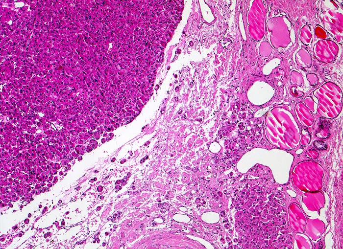 Das Karzinom erscheint als solide zellreiche Tumormasse und unterscheidet sich morphologisch deutlich vom angrenzenden makrofollikulären Parenchym. Die breite Tumorkapsel wird von malignen Follikeln durchsetzt. Jenseits der Kapsel ist Tumorgewebe erkennbar, das die Kapsel durchbrochen hat und unmittelbar an das normale Parenchym angrenzt.