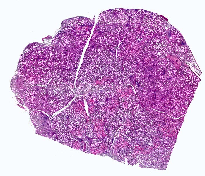 Das normale Schilddrüsenparenchym ist lobuliert. Schmale Bindgewebssepten separieren die einzelnen Läppchen voneinander. Bei einer Vergrösserung der Schilddrüse ohne Knotenbildung spricht man von einer Struma diffusa.
