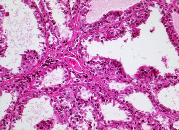 Es fällt auf, dass die Follikel praktisch kein Kolloid enthalten. Zusätzlich sind sie teils entrundet. Das Epithel ist kubisch, teils zylindrisch und besitzt ein relativ helles Zytoplasma. Herdförmig ist das Epithel mehrschichtig (hyperplastisch) und bildet papillenähnliche Strukturen ( Sanderson'sches Polster).