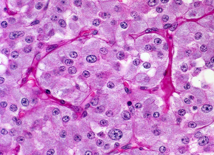 Dieser Bildausschnitt zeigt die typische Morphologie eines Paraganglioms: Das Tumorgewebe besteht aus «Zellballen», knotigen Anordnungen zytoplasmareicher Tumorzellen. Diese Knoten werden von zarten Bindegewebesepten mit kapillären Gefässen umgeben. Das Chromatin der rundlichen Kerne ist fein granuliert. Das basophile Zytoplasma enthält ebenfalls feine Granula.