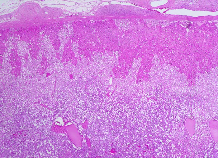 Der gefässreiche basophile Tumor ist nicht bekapselt. Der Tumor infiltriert die Nebennierenrinde zungenförmig. Im periadrenalen Weichteilgewebe sind Anschnitte eines peripheren Nerven erkennbar.