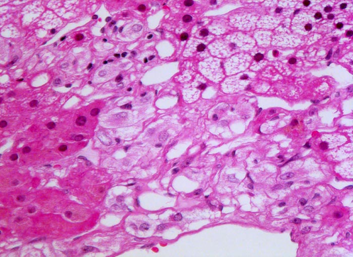 Basophile Tumorzellen, welche an normales Nebennierenmark erinnern infiltrieren die Zona fasciculata ( lipidreiche Zellen mit vakuolisiertem Zytoplasma) und die Zona reticularis ( lipofuscinhaltige Zellen).