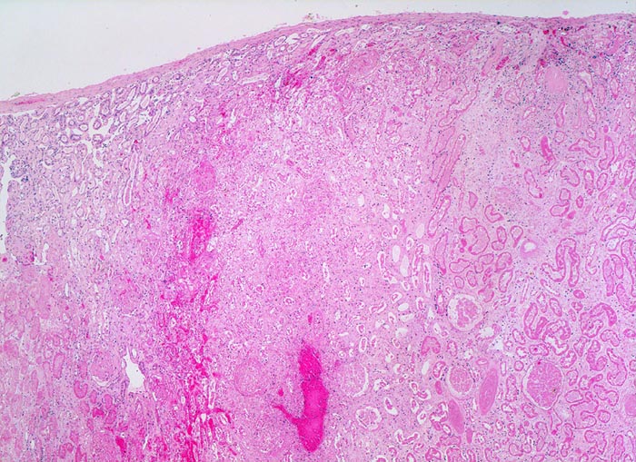 Im Infarktareal sind Tubuli und Glomerula noch schattenhaft erkennbar. Hämorrhagischer Randsaum zwischen Nekrose und vitalem Parenchym. Ein sehr schmaler Saum von vitalem Parenchym ist an der Rindenoberfläche dank Kollateralen aus der Nierenkapsel erhalten.