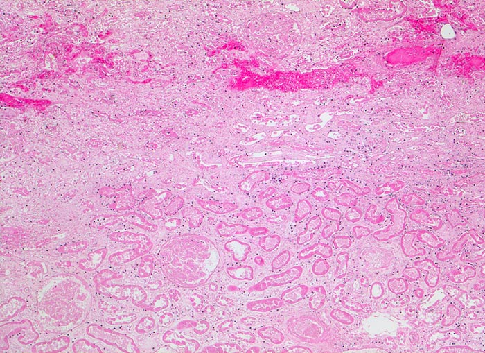 Ausschnitt aus dem Randbereich der Koagulationsnekrose mit hämorrhagischem Randsaum (oben)