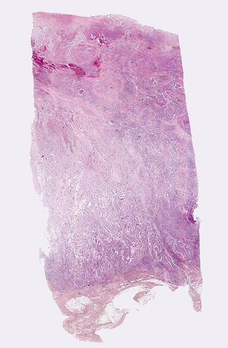 Querschnitt durch die Harnblasenwand. Anstelle von Mukosa und muskulärer Harnblasenwand findet sich ein ulzerierter Tumor mit fokalen Einblutungen. Der Tumor infiltriert das perivesikale Fettgewebe.