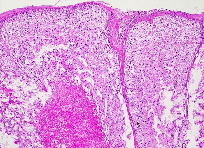 Der typische mikroskopische Aspekt hat dem hellzelligen (= klarzelligen) Nierenzellkarzinom seinen Namen verliehen. Das helle Zytopla kommt durch eine Akkumulation von Phospholipiden, Neutralfetten und Glykogen zustande.