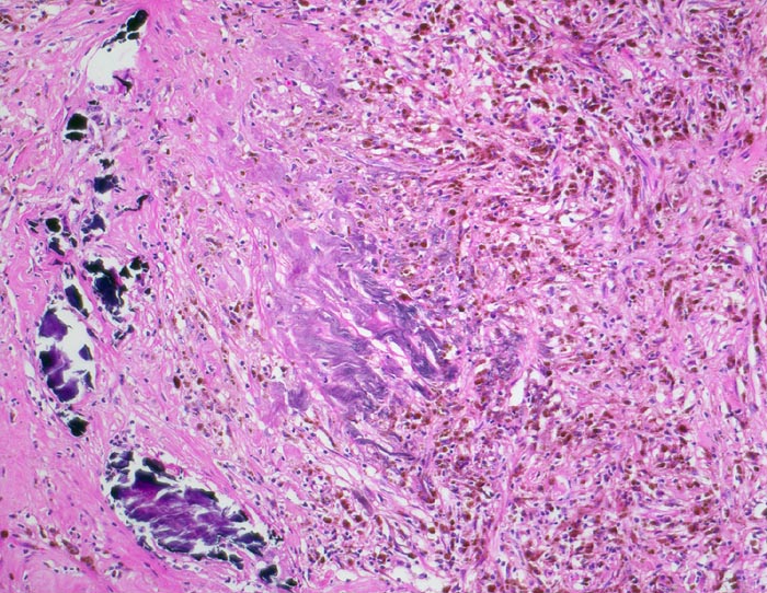 Sklerosiertes Stroma mit grobscholligen dystrophen Verkalkungen und Blutungsresiduen in Form von hämosiderinbeladenen Makrophagen (braune Zellen in der rechten Bildhälfte).