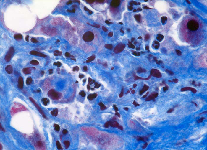 Neutrophile Granulozyten gruppieren sich um einen Hepatozyten mit einem Mallory Körperchen (sogenannte neutrophile Satellitose). Neben den Granulozyten finden sich auch mononukleäre Entzündungszellen. Ein Teil der Hepatozyten ist grobtropfig verfettet. Die roten intrazytoplasmatischen Kugeln entsprechen Megamitochondrien.