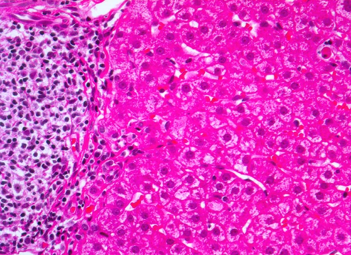 Links im Bild Portalfeld mit starker Vermehrung von mononukleären Zellen. Das Infiltrat greift stellenweise auf das angrenzende Parenchym über (=periportale Hepatitis oder Interface Hepatitis). Das Parenchym ist weitgehend Entzündungsfrei. Es ist eine einzelne Apoptose erkennbar (=Councilman Körperchen oder Einzelzellnekrose).