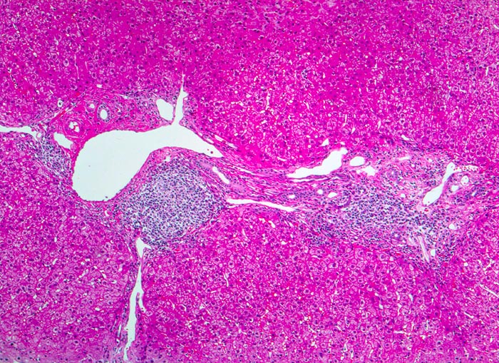 Dichtes lymphoides Infiltrat in den Portalfeldern mit Ausbildung eines Follikels. Stellenweise greift die Entzündung auf das angrenzende Parenchym über ( periportale Hepatitis). Zwischen den fibrosierten Portalfeldern verlaufen bindegewebige Septen.