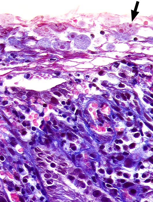 Auf dem Oberflächenepithel liegen zahlreiche Amöben mit feinkörnigem hellblauem Zytoplasma. Ein Teil davon mit