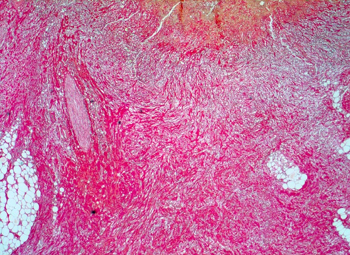 Orangerotes Quellungsfibrinoid. Granulationsgewebe. Narbenschicht.