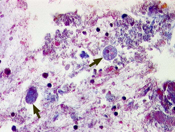 Im Schleim, welcher dem Kolon aufgelagert ist, liegen ► Amöben mit feinkörnigem hellblauem Zytoplasma und kleinem rundem Kern. Einer davon mit phagozytierten Erythrozyten (Trophozoit Magnaform).