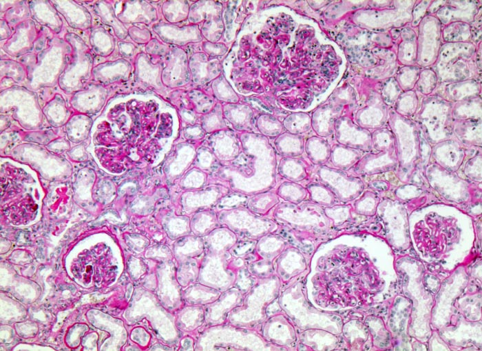 Die Glomeruli sind auffallend gross und kompakt. Die Kapillarschlingen erscheinen angedeutet lobuliert. Das Mesangium ist verbreitert und zellreicher als normal. Diskrepanz zwischen deutlich geschädigten Glomeruli und weitgehend unauffälligem tubulointerstitiellem Raum. Schon in der Übersicht wirken die Basalmembranen der Kapillarschlingen verdickt.