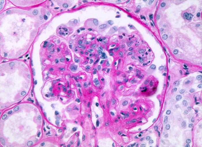 Verbreiterung des Mesangiums mit Zellvermehrung. Die Kapillarlumina sind teilweise eingeengt und enthalten Monozyten und neutrophile Granulozyten. Die periphere Basalmembran ist stellenweise verdoppelt. Der Basalmembran sitzen aussen vergrösserte aktivierte Podozyten auf.