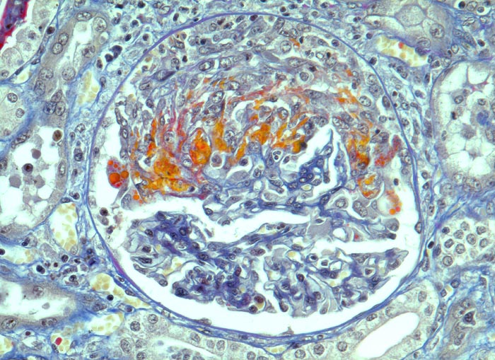 Frische segmentale Schlingennekrosen mit exsudiertem Fibrin und Protein (rot). Beginnende Proliferation von Kapselzellen. Dazwischen einzelne neutrophile Granulozyten.