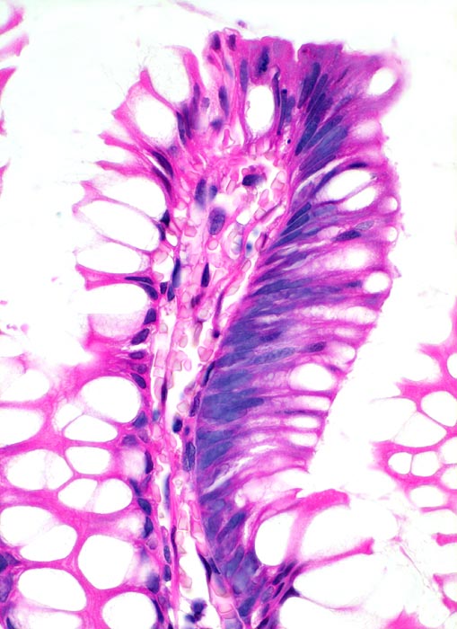 In diesem Drüsenschlauch ist nur die rechte Hälfte des bedeckenden Epithels dysplastisch verändert. Im dysplastischen Epithel stehen die Kerne deutlich dichter und überlappen sich teilweise. Die Kerne sind leicht vergrössert, haben eine irreguläre Kontur und sind nicht ausschliesslich basal, sondern auch lumenwärts lokalisiert. Die dysplastischen Becherzellen enthalten deutlich kleinere Schleimvakuolen.