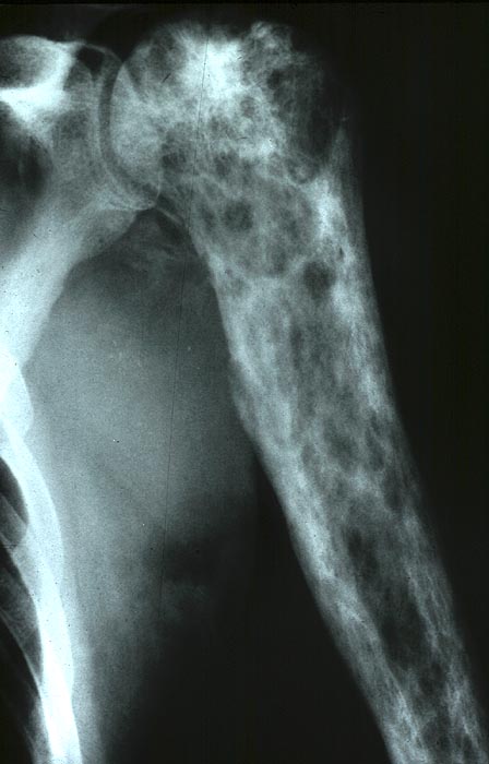 Neben lytischen Veränderungen Ablagerung von fleckförmig verkalkter Knorpelmatrix.