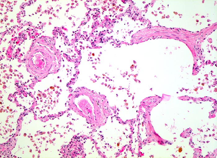 Die Alveolarsepten sind deutlich fibrotisch verdickt und enthalten eine verminderte Anzahl Kapillaren. Die Alveolen enthalten zahlreiche braun gefärbte Alveolarmakrophagen, welche die aus den Alveolarkapillaren ausgetretenen Erythrozyten phagozytieren. Zwei Venolen mit verdickter Gefässwand.