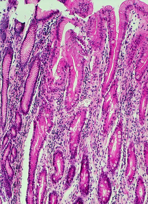 Am linken Bildrand sind Schleimdrüsen vom Magenantrumtyp erkennbar. Die übrigen Drüsen enthalten Becherzellen und erinnern an Dünndarmschleimhaut. Die Lamina propria ist entzündlich infiltriert.