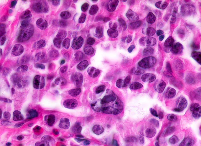 Atypische Zellen bilden tubuläre Strukturen. Die Malignität lässt sich an den stark vergrösserten, polymorphen, hyperchromatischen Kernen mit prominenten und irregulär geformten Nukleolen ablesen.
