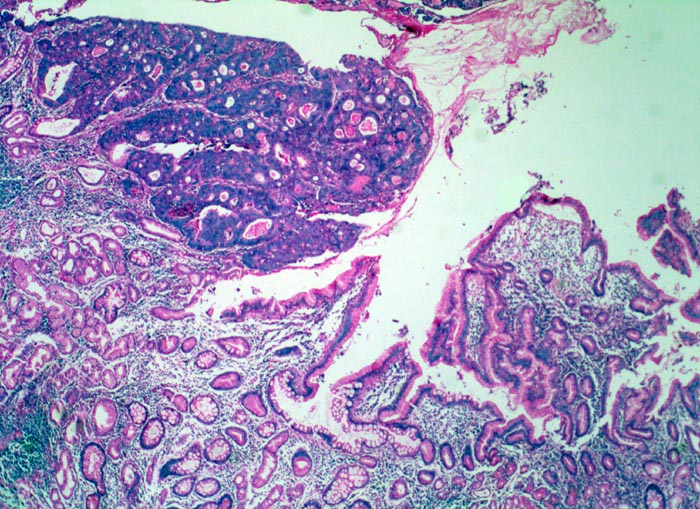 Die Lamina propria der Antrumschleimhaut ist entzündlich infiltriert. Neben Schleimdrüsen vom Antrumtyp finden sich zahlreiche metaplastische Drüsen mit Becherzellen. Die Mukosa wird von einem polypoiden scharf begrenzten Tumor infiltriert. Aufgrund der vergrösserten Kerne ist das Tumorgewebe deutlich basophiler als die Drüsen der Mukosa. Der Tumor bildet dos à dos liegende Drüsen (kribriformes Wachstumsmuster).