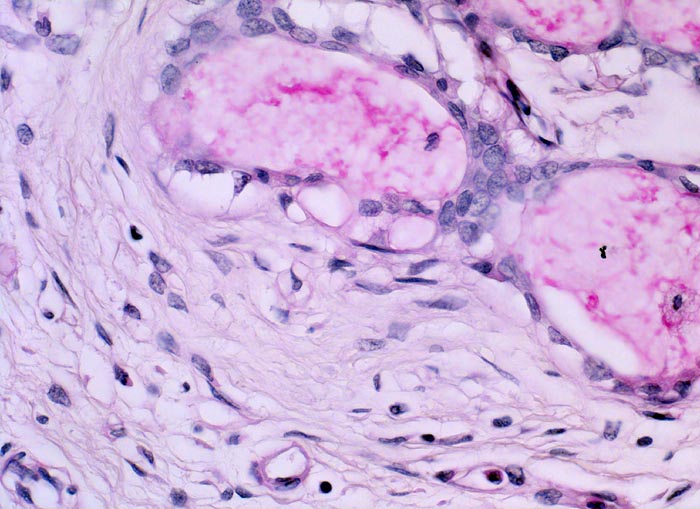 Gänge gefüllt mit PAS positivem Schleim. Lockere Fibrose des Interstitiums mit spärlichem chronischem