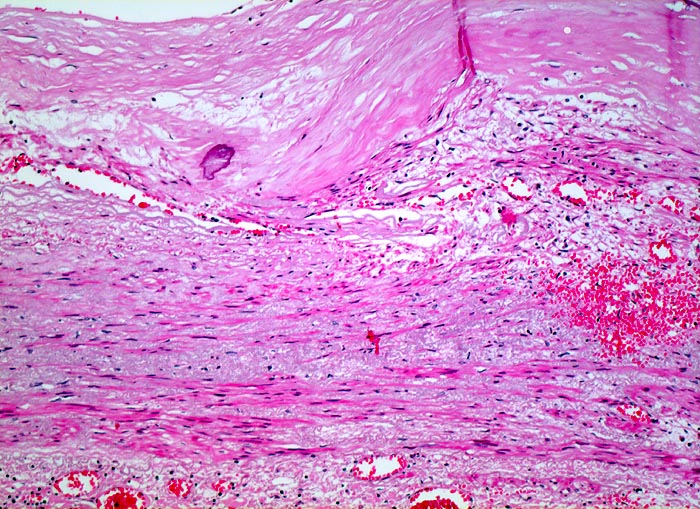 Fibrosierte herdförmig verkalkte Intima. Atrophe glatte Muskulatur der Media mit frischen Einblutungen.