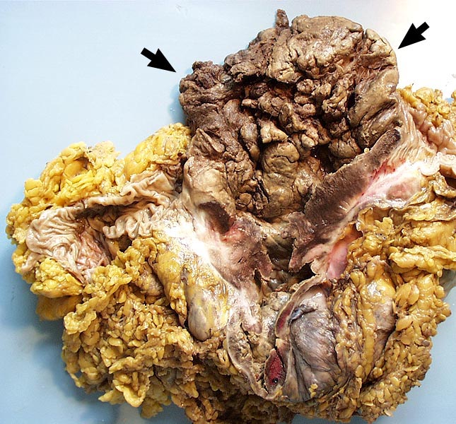 Grauschwarzer Tumor im Bereich der linken Kolonflexur.