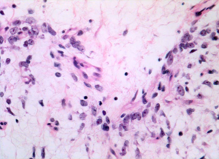 Tumorzellen mit rundlichen Kernen und feinen eosinophilen Nukleolen.