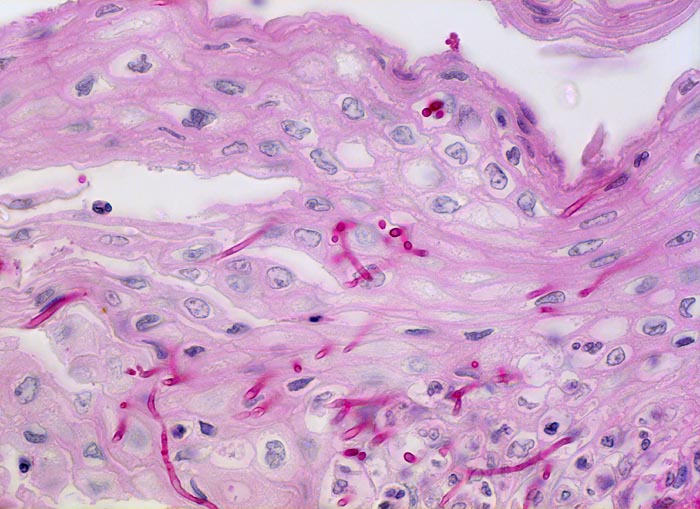 Die obersten Schichten der erhaltenen Mukosa werden von schlanken Soorpseudohyphen durchsetzt.