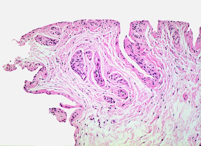Die Innenauskleidung von Gelenken, Sehnenscheiden und Bursen wird von einer spezialisierten epithelähnlichen Synovialmembran ausgekleidet. Diese sezerniert Synovia. Die Synovialis besteht aus 1-4 Synovialzellagen, die an der Unterseite mit einer Zone von lockerem gut vaskularisiertem kollagenem Bindegewebe verschmelzen, in dem Fettzellen, Fibroblasten, Mastzellen und Makrophagen vorkommen. Eine kontinuierliche Basalmembran ist nicht ausgebildet. Die Synovialzellen können flach und mesothelähnlich, spindelförmig, polyedrisch oder kubisch sein. Typ A Synoviozyten sind phagozytisch tätig, Typ B Zellen produzieren reichlich Proteine und haben entsprechend ein gut entwickeltes rauhes endoplasmatisches Reticulum.