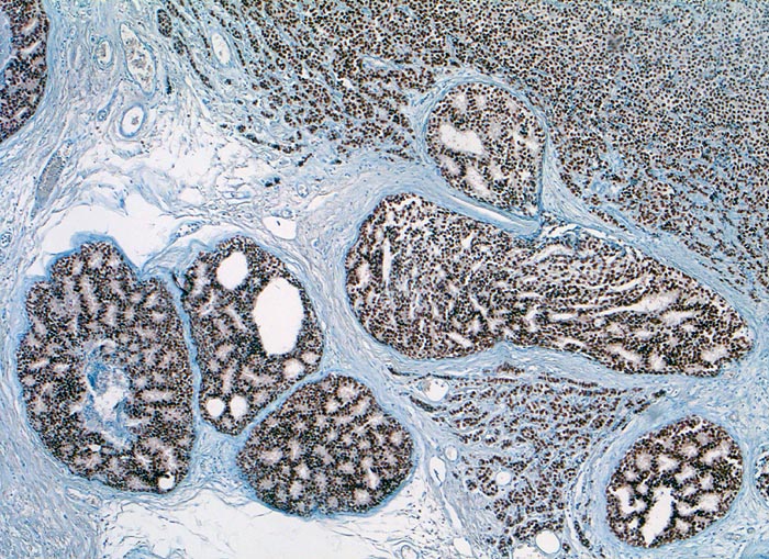 Innerhalb einer Basalmembran liegende kribriforme Strukturen eines duktalen in situ Karzinoms. Daneben das infiltrativ wachsende invasive Karzinom. Beide Komponenten sind stark positiv für den Östrogenrezeptor.