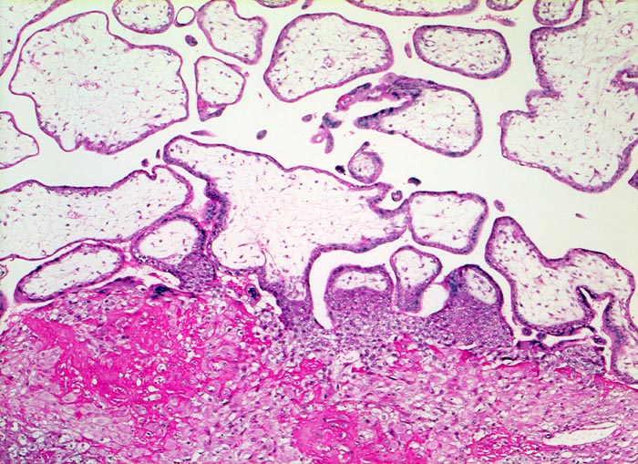 Unten im Bild die hellen zytoplasmareichen Zellen der Dezidua durchmischt mit einer Schicht von hypereosinophilem Fibrinoid. Ein Teil der Zotten, die Haftzotten, sind über proliferiertes Trophoblastepithel mit der Dezidua verankert. Kernknospe.