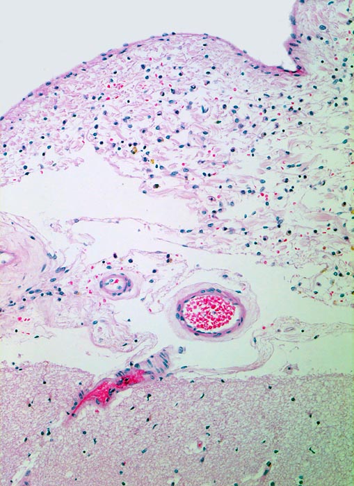 Der Subarachnoidalraum wird begrenzt von der Arachnoidea und der Pia mater, welche an die Hirnrinde unten im Bild angrenzt. Der Subarachnoidalraum enthält Liquor und Gefässe. Zarte Kollagenfasern verlaufen zwischen äusserem und innerem Blatt der weichen Hirnhaut.