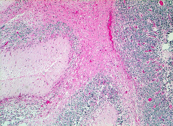 Schlecht erhaltenes Kleinhirn angrenzend an das Medulloblastom (in diesem Bild nicht sichtbar). Kleinhirnmark, Stratum moleculare und Körnerschicht der Kleinhirnrinde.
