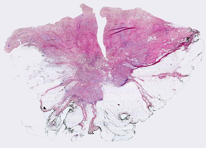 Bindegewebsreicher Tumor mit sternförmigen Ausläufern in das Fettgewebe. Einer der Ausläufer reicht bis unmittelbar an den tuschemarkierten Resektatrand heran.