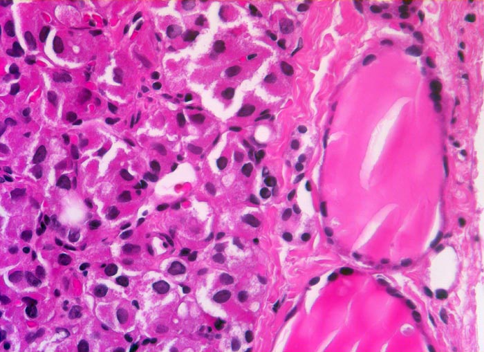Rechts im Bild zwei normale Follikel mit flachem Epithel und reichlich Kolloid. Die neoplastischen Follikel links im Bild sind sehr klein und enthalten kaum Kolloid. Die Tumorzellen haben vergrösserte polygonale Kerne und reichlich Zytoplasma.