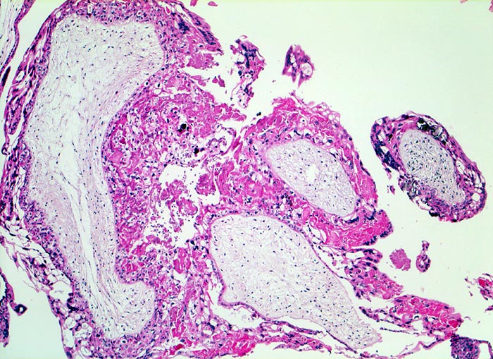 Gefässfreie blasig aufgetriebene Villi bedeckt von zirkulär proliferiertem Trophoblastepithel.