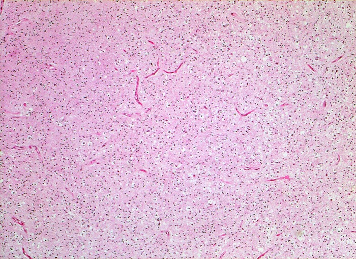 Die von einem Halo umgebenen Tumorzellen erinnern bei schwacher Vergrösserung an Oligodendrozyten der weissen Substanz. Zahlreiche verzweigte Kapillaren.