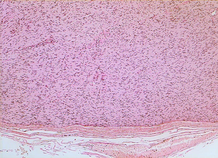 Schwannzellen mit langgezogenen Kernen in welliger Anordnung kennzeichnen den peripheren Nerven. Der Nerv ist umgeben vom Perineurium aus Bindegewebe und Gefässen.