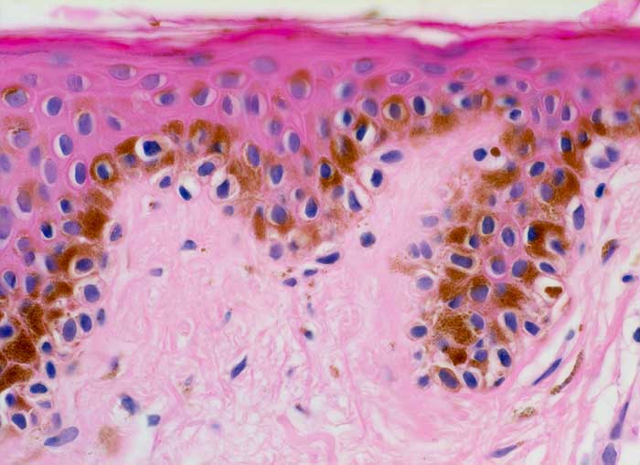 Die Retezapfen sind verlängert. Die Melanozyten sind stark vermehrt, bilden ein kontinuierliches Band und sind umgeben von einem Halo. Die angrenzenden Keratinozyten sind hyperpigmentiert.