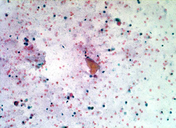 Zytologische Diagnose: Hämorrhagische Zyste. Keine Anhaltspunkte für Malignität.