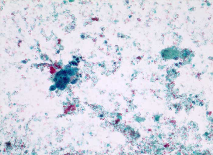 Ovarialzyste links, Feinnadelpunktion: Das ausgestrichene Sediment enthält an einer Stelle ein Aggregat von endometrialen Epithelzellen. Des weiteren erkennt man