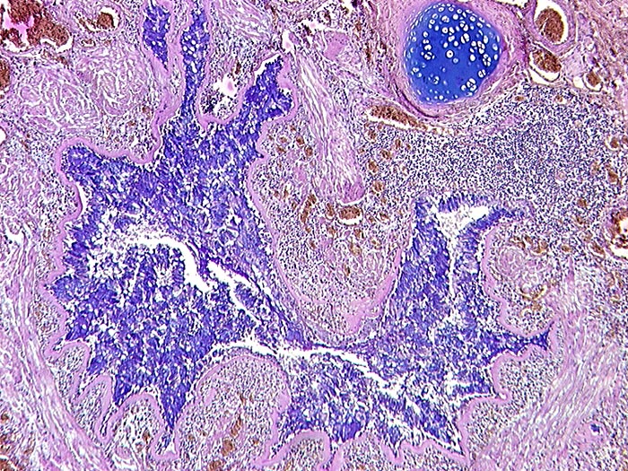 Kleiner Bronchus mit Becherzellhyperplasie, starker Verdickung der Basalmembran und Hypertrophie der glatten Muskulatur. Sternförmiges Lumen.