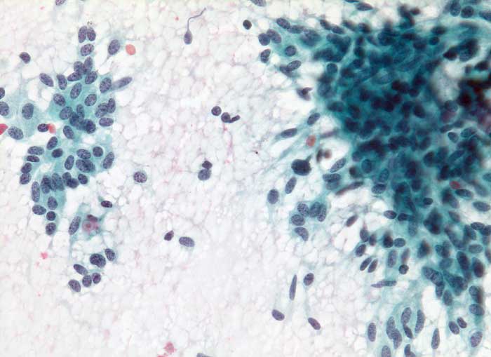 Frischgewebsabstrich: Zellreicher Ausstrich mit Verbänden spindeliger Tumorzellen.