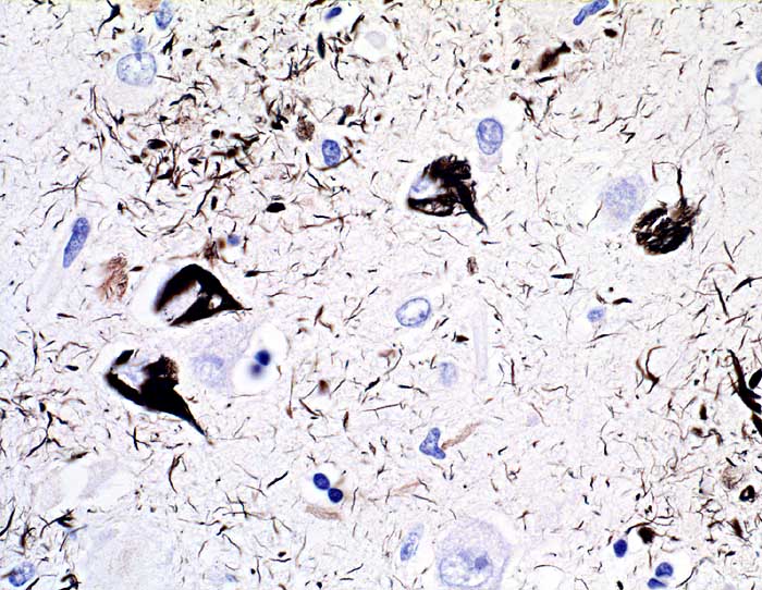 Alzheimerfibrillen (=Tangles) und zahlreiche Neuropilfäden (feine schwarze Fäden).