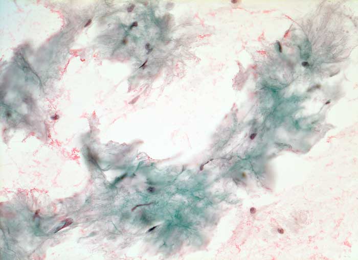 Feinnadelpunktion Parotis: kleine Partikel aus wolkigem fibrillärem Stroma, darin eingelagert Zellen mit spindelförmigen bipolaren oder rundlichen Kernen.
