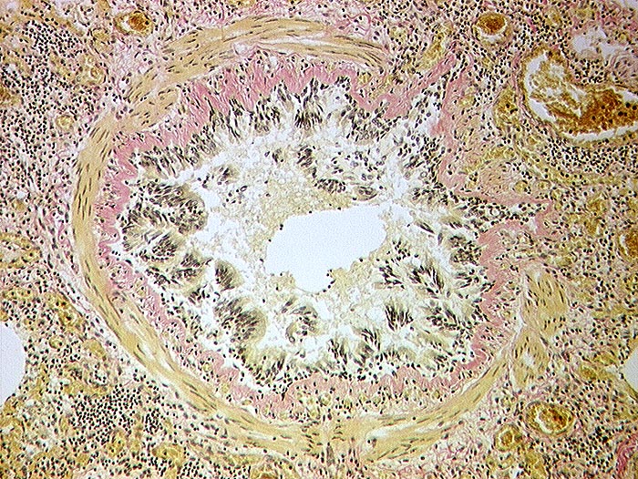 Bronchiolus mit starker Verdickung der Basalmembran und der glatten Muskelschicht.