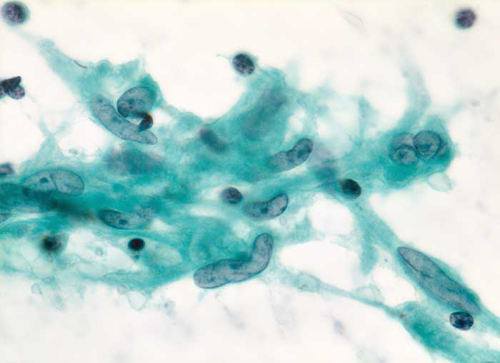 Feinnadelpunktion Parotislymphknoten: Epitheloidzellen mit länglichen, teils gebogenen Kernen und einzelne Lymphozyten. Die Epitheloidzellen erscheinen hypertroph, was in erster Linie an eine Sarkoidose denken lässt.